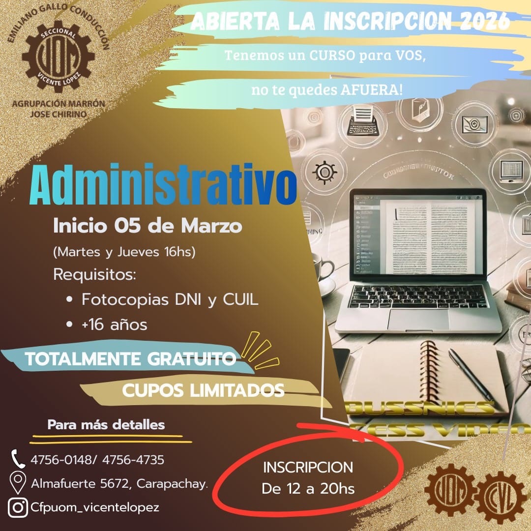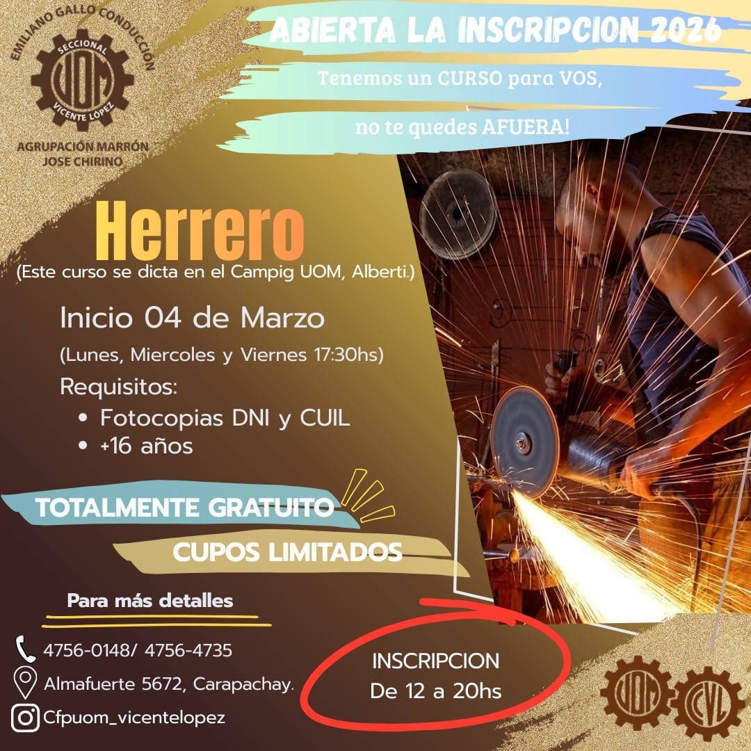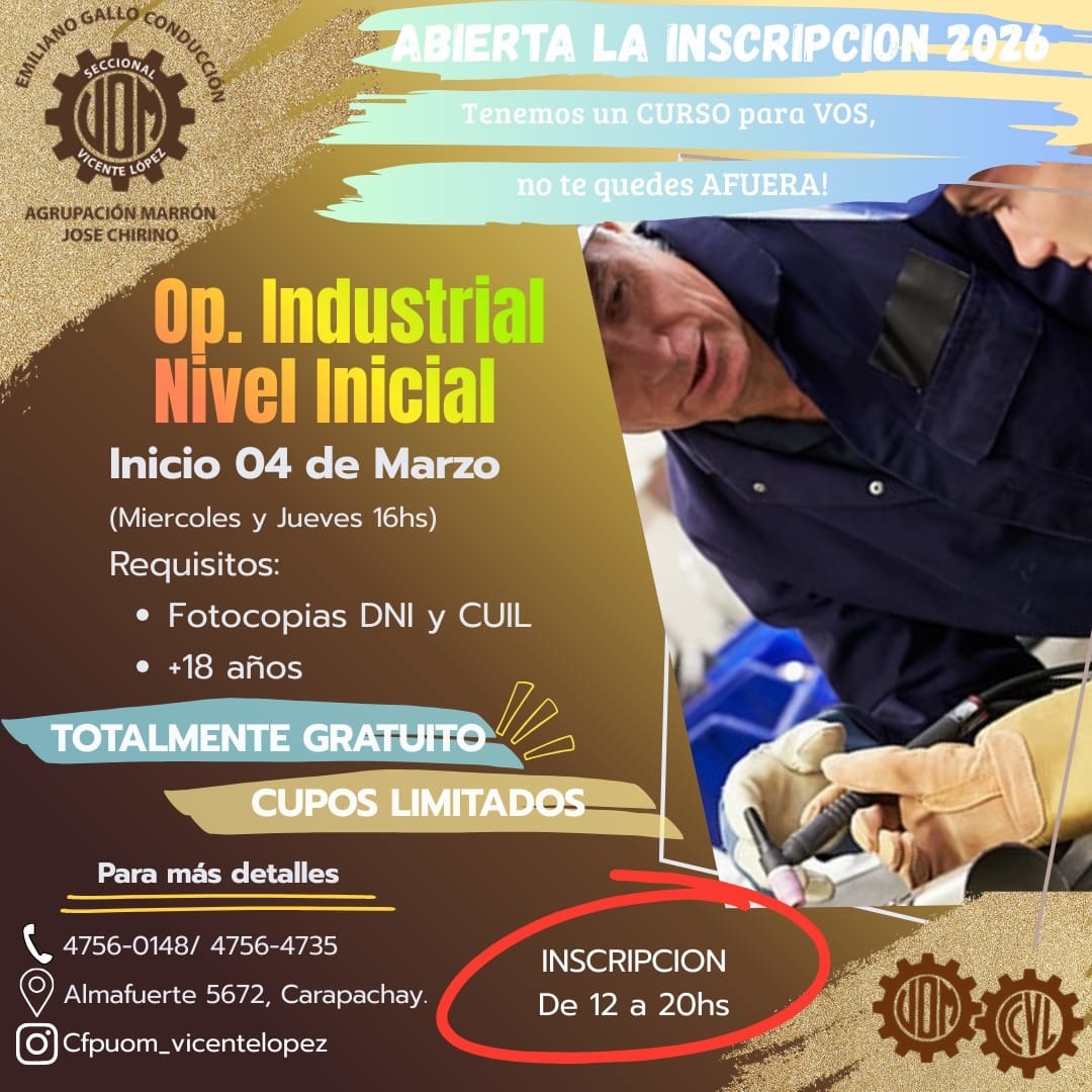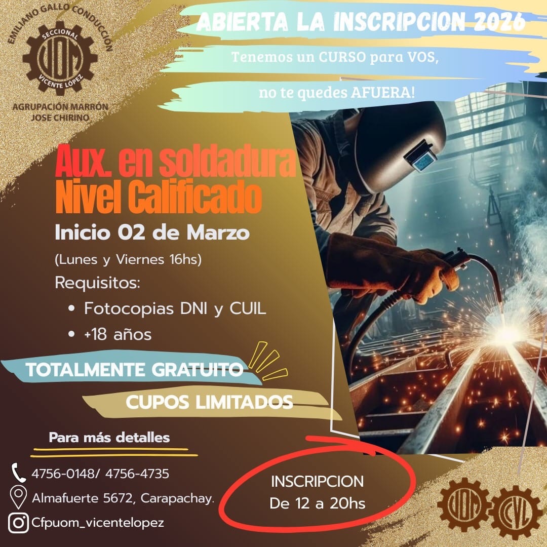 Inicio Gremial Beneficio sindical Cursos Marzo 2026 – Abierta la Inscripición GremialBeneficio sindicalCapacitación Cursos Marzo 2026 – Abierta la Inscripición Por Equipo Editorial UOM Vicente López - 4 febrero, 2026 3 0 Share on Facebook Tweet on Twitter ENTRADAS RELACIONADASMÁS DE ESTE AUTOR Camping AVISO IMPORTANTE: FIESTA DE FIN DE AÑO Beneficio sindical Ciclo Lectivo 2026 – Entrega de Mochilas y útiles Actividades Vacaciones de Invierno a puro cine en el Camping Metalúrgico 4,957FansLike388SeguidoresSeguir16,000SuscriptoresSuscribirse