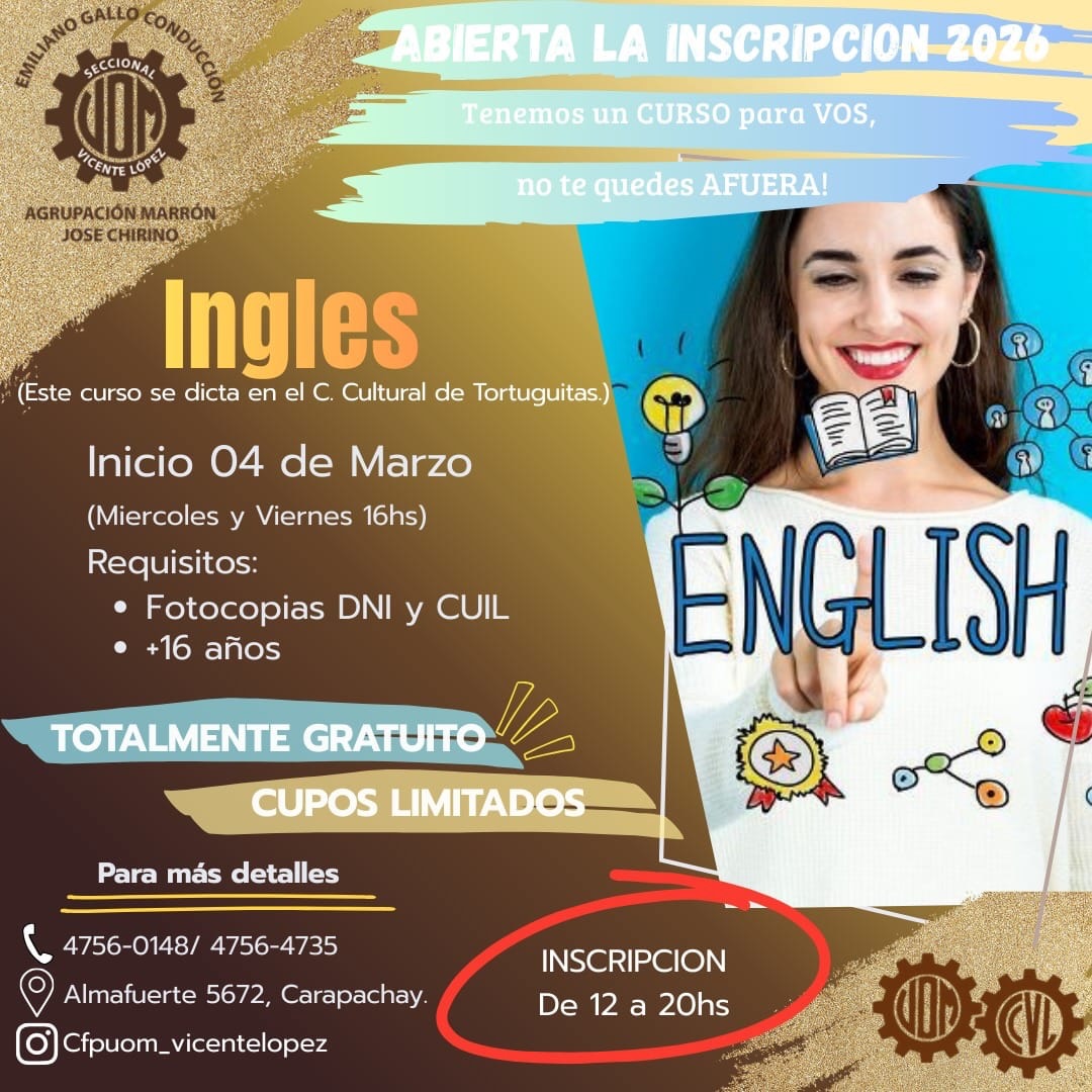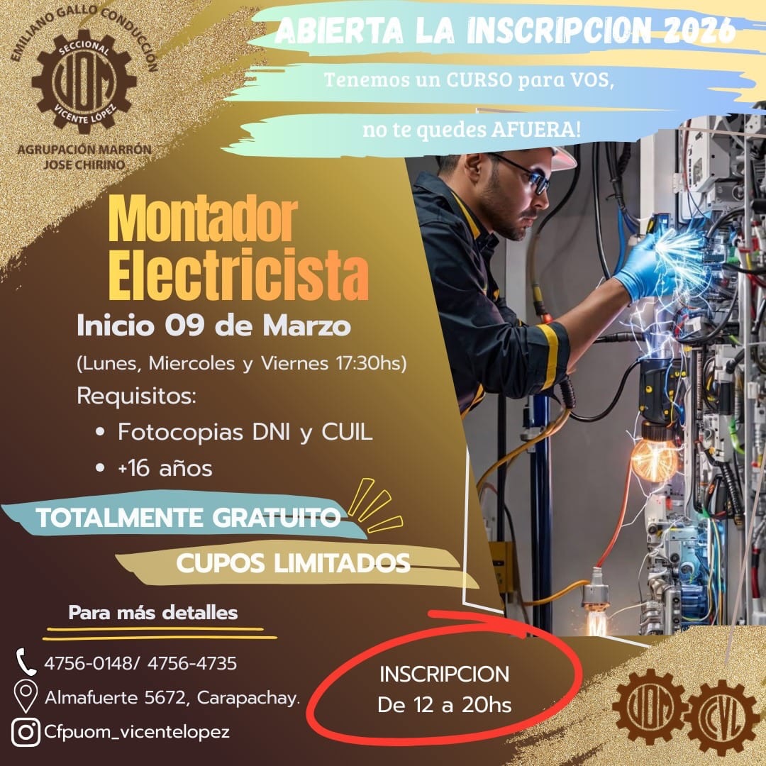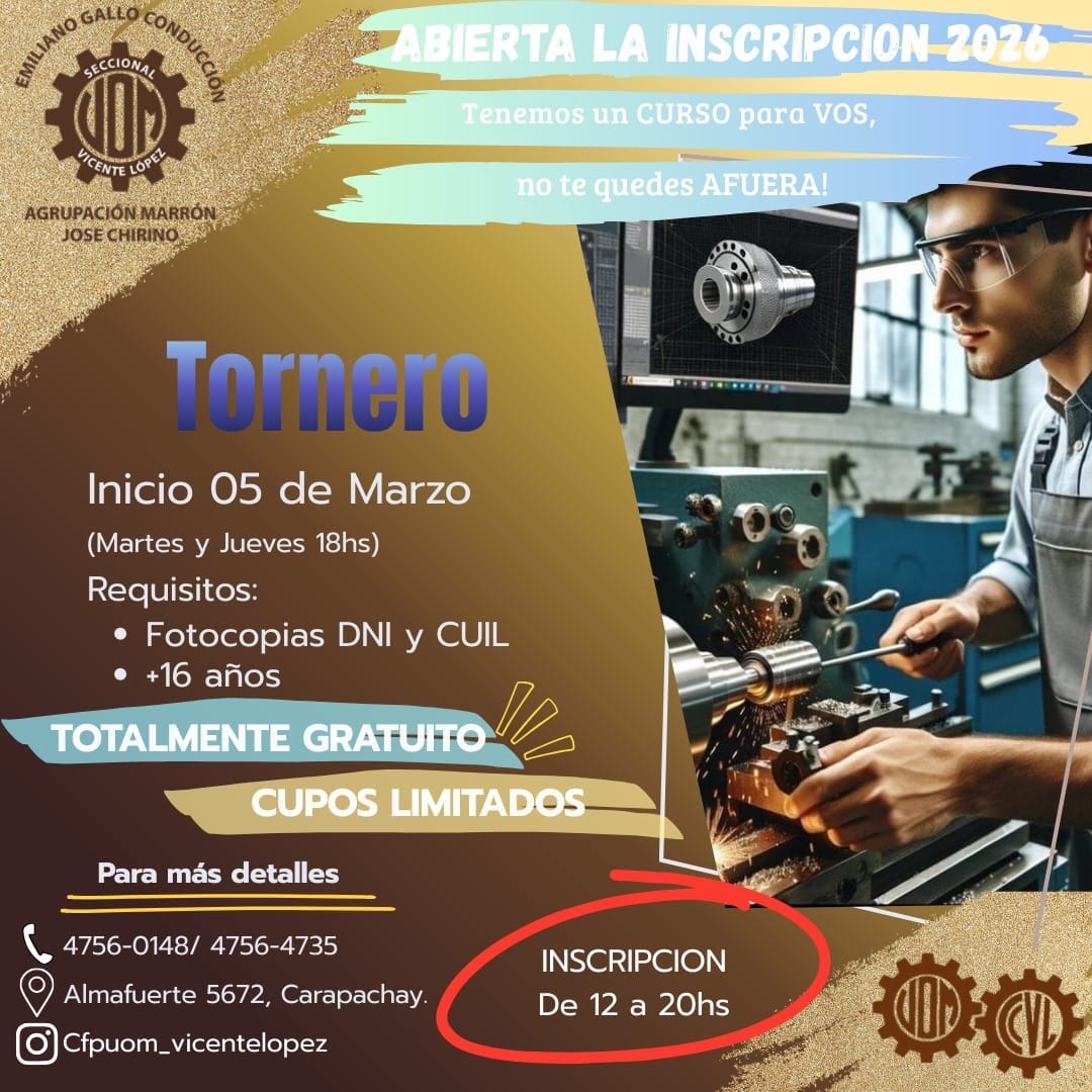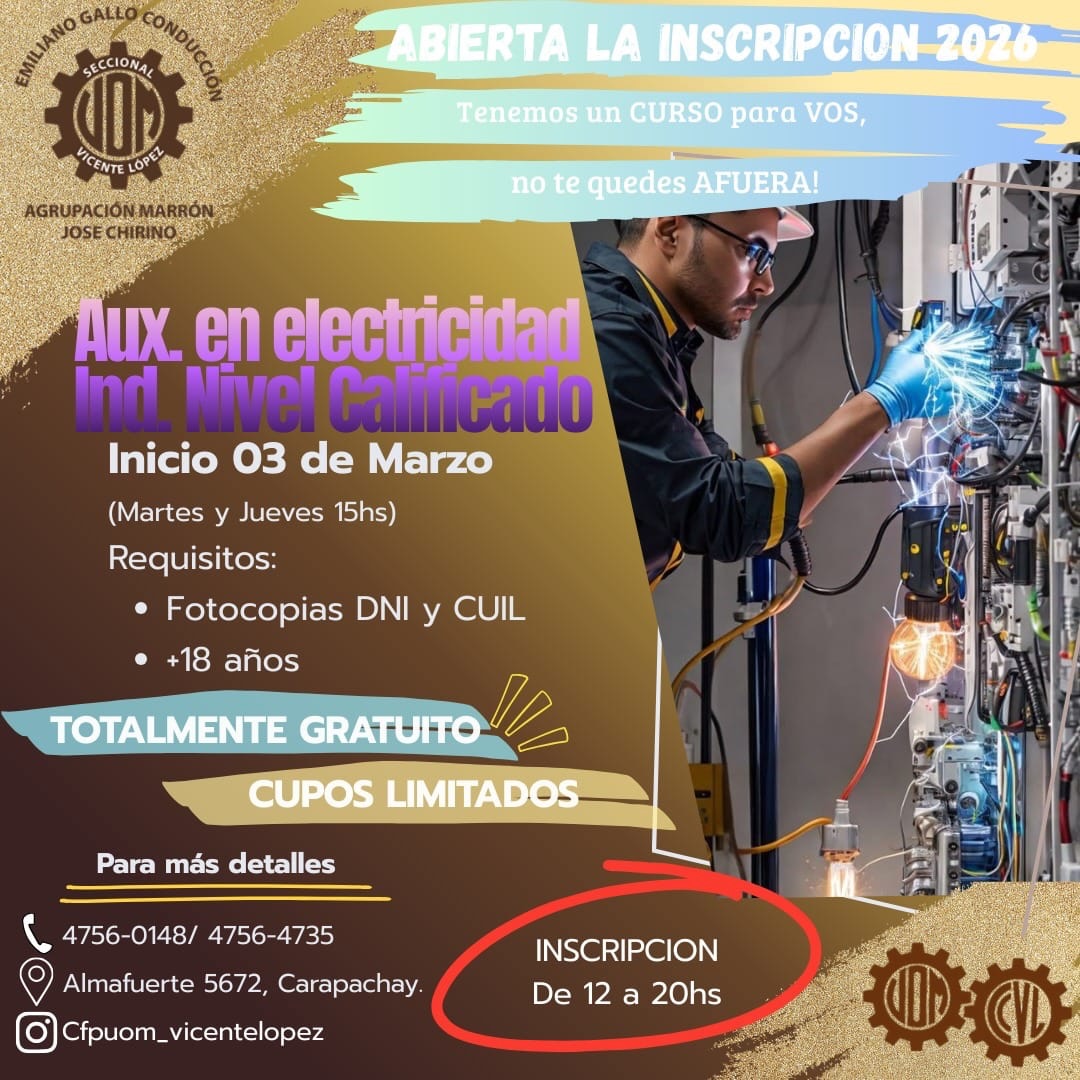 Inicio Gremial Beneficio sindical Cursos Marzo 2026 – Abierta la Inscripición GremialBeneficio sindicalCapacitación Cursos Marzo 2026 – Abierta la Inscripición Por Equipo Editorial UOM Vicente López - 4 febrero, 2026 3 0 Share on Facebook Tweet on Twitter ENTRADAS RELACIONADASMÁS DE ESTE AUTOR Camping AVISO IMPORTANTE: FIESTA DE FIN DE AÑO Beneficio sindical Ciclo Lectivo 2026 – Entrega de Mochilas y útiles Actividades Vacaciones de Invierno a puro cine en el Camping Metalúrgico 4,957FansLike388SeguidoresSeguir16,000SuscriptoresSuscribirse